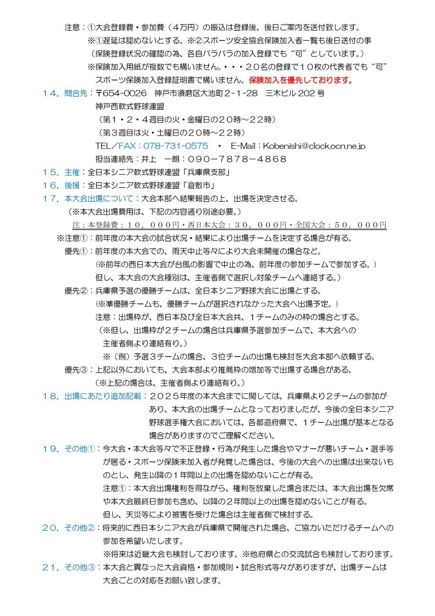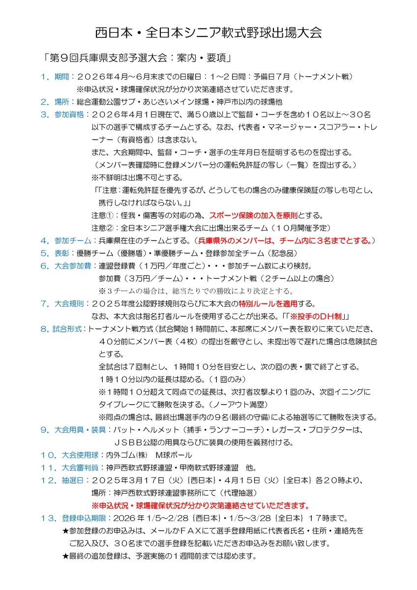 西日本・全日本シニア軟式野球出場大会 第9回兵庫県支部予選大会 公開日 : / 更新日 : お知らせ シニア軟式野球大会 Tweet Tweet西日本・全日本シニア軟式野球出場大会 第9回兵庫県支部予選大会の案内及び要項です。 【問い合わせ先】 E-Mail:kobenishi@clock.ocn.ne.jp Tweet 関連記事 第1回兵庫県支部予選大会 案内・要項 第5回大会は締め切りました 第2回兵庫県支部予選大会 案内・要項 西日本・全日本シニア軟式野球出場大会 第8回兵庫県支部予選大会 第6回大会の受付は締め切りました 「2025年神戸西リーグ チーム一覧」